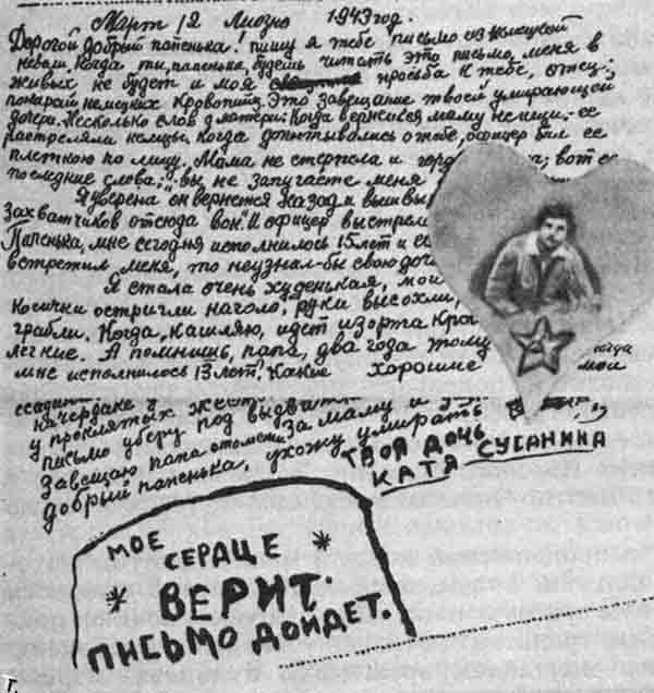 Она была настолько доведена до отчаяния, что решила покончить жизнь самоубийством в день своего 15-летия, но перед этим написала последнее письмо отцу на фронт. Читать тяжело, но очень стоит прочтения. К сожалению, к адресату письмо так и не попало, т.к. номер полевой почты, написанной девочкой, на тот момент уже устарел. Март, 12, Лиозно, 1943 год. Дорогой, добрый папенька! Пишу я тебе письмо из немецкой неволи. Когда ты, папенька, будешь читать это письмо, меня в живых не будет. И моя просьба к тебе, отец: покарай немецких кровопийц. Это завещание твоей умирающей дочери. Несколько слов о матери. Когда вернешься, маму не ищи. Ее расстреляли немцы. Когда допытывались о тебе, офицер бил ее плеткой по лицу. Мама не стерпела и гордо сказала: "Вы не запугаете меня битьем. Я уверена, что муж вернется назад и вышвырнет вас, подлых захватчиков, отсюда вон". И офицер выстрелил маме в рот... Папенька, мне сегодня исполнилось 15 лет, и если бы сейчас ты, встретил меня, то не узнал бы свою дочь. Я стала очень худенькая, мои глаза ввалились, косички мне остригли наголо, руки высохли, по-хожи на грабли. Когда я кашляю, изо рта идет кровь - у меня отбили легкие. А помнишь, папа, два года тому назад, когда мне исполнилось 13 лет? Какие хорошие были мои именины! Ты мне, папа, тогда сказал: "Расти, доченька, на радость большой!" Играл патефон, подруги поздравляли меня с днем рождения, и мы пели нашу любимую пионерскую песню... А теперь, папа, как взгляну на себя в зеркало - платье рваное, в лоскутках, номер на шее, как у преступницы, сама худая, как скелет,- и соленые слезы текут из глаз. Что толку, что мне исполнилось 15 лет. Я никому не нужна. Здесь многие люди никому не нужны. Бродят голодные, затравленные овчарками. Каждый день их уводят и убивают. Да, папа, и я рабыня немецкого барона, работаю у немца Шарлэна прачкой, стираю белье, мою полы. Работаю очень много, а кушаю два раза в день в корыте с "Розой" и "Кларой" - так зовут хозяйских свиней. Так приказал барон. "Русс была и будет свинья",- сказал он. Я очень боюсь "Клары". Это большая и жадная свинья. Она мне один раз чуть не откусила палец, когда я из корыта доставала картошку. Живу я в дровяном сарае: в колшату мне входить нельзя. Один раз горничная полька Юзефа дала мне кусочек хлеба, а хозяйка увидела и долго била Юзефу плеткой по голове и спине. Два раза я убегала от хозяев, но меня находил ихний дворник. Тогда сам барон срывал с меня платье и бил ногами. Я теряла сознание. Потом на меня выливали ведро воды и бросали в подвал. Сегодня я узнала новость: Юзефа сказала, что господа уезжают в Германию с большой партией невольников и невольниц с Витебщины. Теперь они берут и меня с собою. Нет, я не поеду в эту трижды всеми проклятую Германию! Я решила лучше умереть на родной сторонушке, чем быть втоптанной в проклятую немецкую землю. Только смерть спасет меня от жестокого битья. Не хочу больше мучиться рабыней у проклятых, жестоких немцев, не давших мне жить!.. Завещаю, папа: отомсти за маму и за меня. Прощай, добрый папенька, ухожу умирать. Твоя дочь Катя Сусанина... Мое сердце верит: письмо дойдет. Вскоре после освобождения белорусского города Лиозно в 1944 году при разборе кирпичной кладки разрушенной печи в одном из домов был найден маленький желтый конверт, прошитый нитками. В нем оказалось письмо белорусской девочки Кати Сусаниной, отданной в рабство гитл