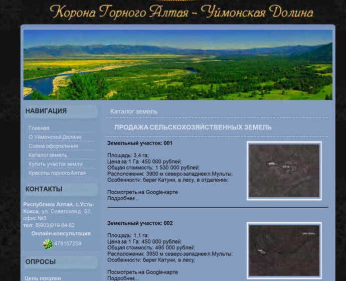 Никому на Алтае не известная Санкт-Петербургская организация «СИОН земля на Алтае» распродает для жилищного строительства состоятельным семьям Запада лучшие заповедные земли в самых живописных, уникальных и неповторимых местах Горного Алтая, или – есть такой расхожий штамп – «Сибирской Швейцарии». «Мы предлагаем Вам стать обладателем собственного оазиса, расположенного в горном Алтае, в легендарной стране Шамбала, где все вокруг пропитано таинственной живительной Силой. Здесь вы ощутите желанную легкость бытия, гармонию и настоящее счастье, а родник жизни в вас вновь станет полноводной рекой!» – на трех языках предлагается будущим жителям легендарной страны Шамбалы. |
