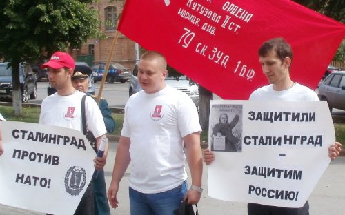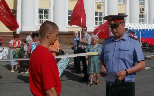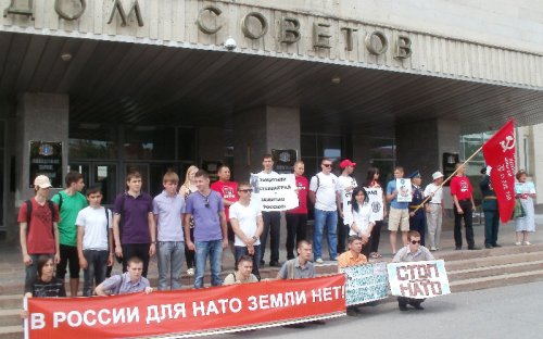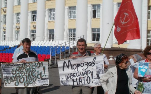 2012-05-22 13:52 Пресс-служба Ульяновского обкома КПРФ 22 мая 2012 года в городе Ульяновске обком КПРФ провел очередные публичные мероприятия против планов развертывания базы НАТО в аэропорту «Ульяновск-Восточный». Как было объявлено председателем ЦК КПРФ Геннадием Зюгановым на митинге 21 апреля в Ульяновске во время проведения Всероссийской акции протеста, в наш город для участия в пикетах и митингах будут приезжать делегации из различных регионов нашей страны. Символично, что первыми в Ульяновск прибыли представители города-героя Сталинграда. Во время Великой Отечественной войны именно в боях за этот город на Волге Красная армия нанесла смертельный удар фашистскому зверю. В наши дни в другом волжском городе – Ульяновске все патриоты нашей Родины под руководством коммунистов начали масштабные действия против допуска в сердце страны агрессивного блока НАТО. Запланированный первоначально пикет на площади Ленина у здания областной администрации, которую возглавляет единоросс Сергей Морозов, получивший у населения прозвище «Швейцар НАТО», пришлось проводить в формате встречи с депутатом ЗСО, руководителем фракции КПРФ Александром Кругликовым. Администрация города Ульяновска, систематически придерживающаяся в отношениях с гражданами принципа «Тащить и не пущать!», не смогла придумать ничего лучше, чем предложить провести пикет на окраине города, мотивируя это тем, что на площади Ленина в заявленное время будет проводиться «публичное мероприятие в рамках проведения Открытого городского фестиваля творчества «Летний венец - 2012». Как это «публичное мероприятие» выглядит, очень хорошо видно на фотографии абсолютно пустой площади. Как говорил подручный Сатаны, один из героев романа Михаила Булгакова «Мастер и Маргарита»: «Поздравляем вас, господа соврамши!». Поскольку подобное вранье стало для администрации города традицией, коммунисты готовят заявление в суд по факту воспрепятствования осуществлению конституционных прав граждан, а именно статьи 31 Конституции Российской Федерации, которая гласит «Граждане Российской Федерации имеют право собираться мирно, без оружия, проводить собрания, митинги и демонстрации, шествия и пикетирования». Лозунги и плакаты, с которыми стояли участники мероприятия, недвусмысленно свидетельствовали об их отношении как к циничным благоглупостям, которые изрек прошедший серьезную обработку в штаб-квартире НАТО вице-премьер путинско-медведевского правительства г-н Рогозин, так и к возможной личной заинтересованности в размещении натовского «пункта подскока» губернатора Морозова. Цветные плакаты с карикатурными изображениями этих господ и туалетная бумага в руках собравшихся оживляли мероприятия. После встречи с депутатом коммунисты и их сторонники встретились в сквере имени Карамзина с проводящими там протестные мероприятия обманутыми дольщиками. В 11:00 был проведен пикет у здания Законодательного Собрания Ульяновской области, на котором выступили прибывшие в наш город комсомольцы Сталинграда. Следует отметить, что сотрудники полиции вели себя весьма корректно и даже подполковник полиции Горшков не пытался вырвать копию Знамени Победы у полковника Советской Армии в отставке Королева, хотя и находился неподалеку. Публичные мероприятия против намерения разместить базу НАТО на