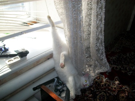 А у нас кошка Соня, 6 лет. Всеобщая любимица. Вроде турецкой породы. Часто её так и зовём - Турка нерусская. Однажды захожу домой - гвалт стоит, смотрю - она запуталась ногой в жалюзях. Пытаюсь распутать - не получается, пошёл за ножницами да и фотик прихватил, дай, думаю, засниму для истории и для своих. Не сочтите за жестокость, просто и слёзы и смех.