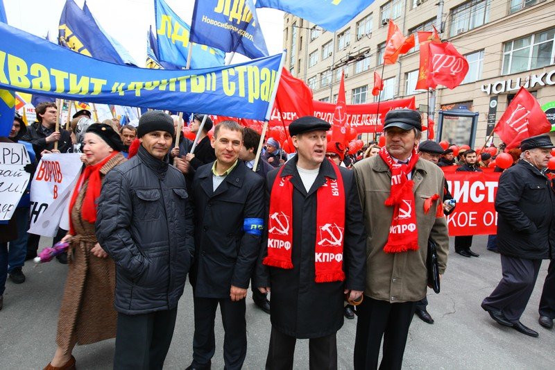 2012-05-01 15:50 Любовь Наряднова, kprfnsk.ru 1 мая в Новосибирске состоялись традиционная демонстрация, посвященная Дню международной солидарности трудящихся. Консолидированная оппозиция прошла шествием от площади Ленина по Октябрьской магистрали и ул. Кирова до площади перед ГПНТБ, где состоялся митинг. В праздновании Дня международной солидарности трудящихся приняло участие около четырех тысяч новосибирцев. Во главе колонны шли первый секретарь Новосибирского обкома КПРФ, депутат Госдумы Анатолий Локоть, второй секретарь обкома КПРФ, депутат горсовета Ренат Сулейманов, секретарь обкома КПРФ Алексей Русаков, депутат Госдумы РФ Александр Абалаков, депутат Законодательного собрания Новосибирской области Вадим Агеенко, председатель Новосибирского областного Совета ветеранов Вячеслав Журавлев. В руках участников шествия были алые стяги, красные шары, первомайские транспаранты, портреты В. И. Ленина и И. В. Сталина. Наряду с людьми старших поколений, в рядах демонстрантов было много молодежи. К краснознаменным колоннам коммунистов присоединились и другие оппозиционные партии — ЛДПР, «Справедливая Россия», «Патриоты России» и «Яблоко». Второй год подряд в Новосибирске оппозиционные партии единым фронтом выступили против политической монополии «Единой России». В ходе демонстрации и митинга съемочная группа КПРФНск вела прямую видео-трансляцию первомайских мероприятий.