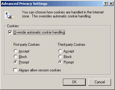 Для Internet Explorer 6.0 настроечки у меня стоят так (англ. версия, из меню Tools - Internet options, в открывшемся диалоге закладка Privacy - кнопка Advanced.