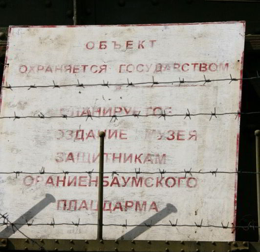 В нём все символы путинского безвременья: ОБЪЕКТ ОХРАНЯЕТСЯ ГОСУДАРСТВОМ ПЛАНИРУЕТСЯ СОЗДАНИЕ мУЗЕЯ ЗАЩИТНИКАМ ОРАНИЕНБАУМСКОГО ПЛАЦДАРМА Охраняется??? Видим, как охраняется .Планируется. В бесплановой экономике? Это составная часть "плана Путина"? Нет. Это перспектива исполнения всего этого "плана". Для нас для всех Колючая проволока поверх полустертой записи о прежних обещаниях. |