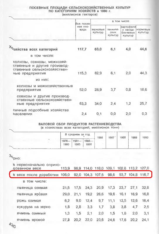 Зерновых за последнюю пятилетку в РСФСР в среднем собирали по 105 млн тонн (в СССР - 200-220 млн тонн!!!), а дерьмократы за последние 19 лет только 2 раза сумели обеспечить валовый сбор в стране более 100 млн тонн!!!