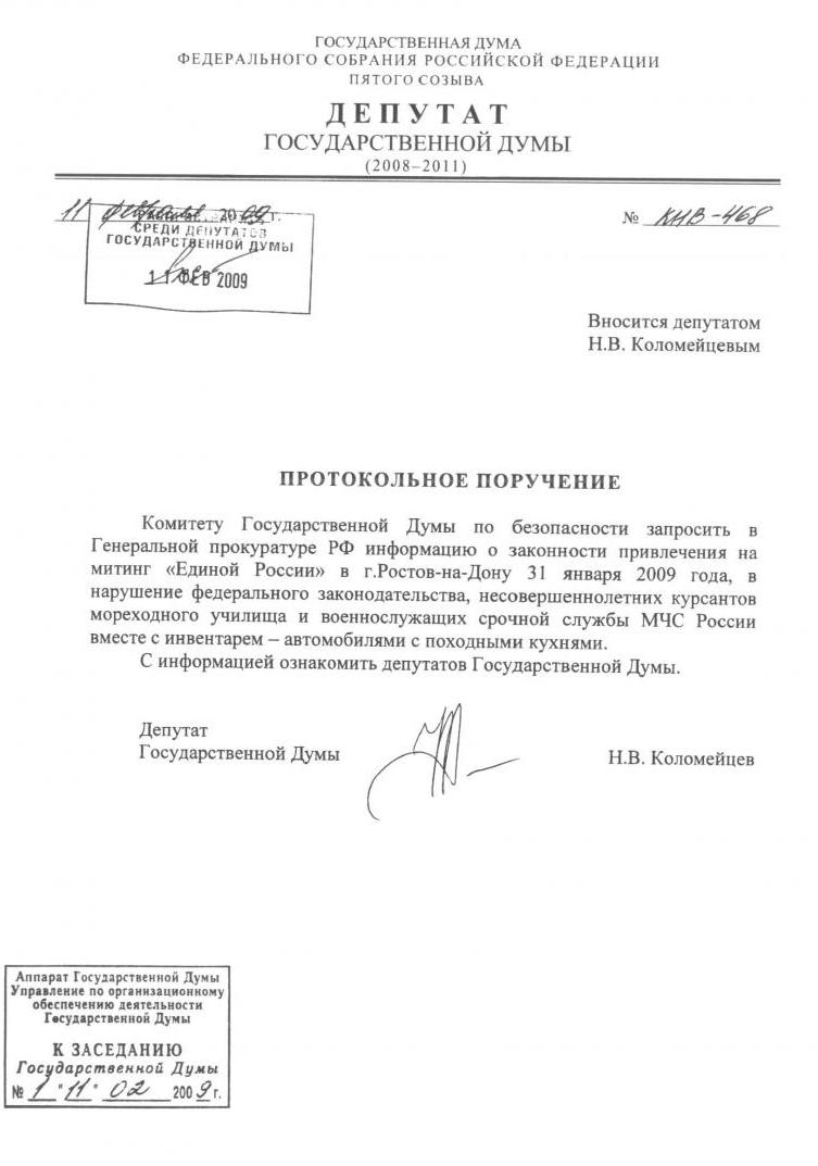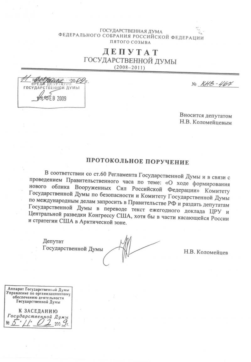 Н.В. Коломейцев (фракция КПРФ). В соответствии с 60-ой статьёй Регламента и в связи с тем, что мы в день больного рассматриваем новый облик Вооружённых Сил, предлагаю всё-таки сделать вопрос открытым, потому что ЦРУ знает больше, чем наш министр обороны. Не надо закрывать некомпетентность министра закрытием "правительственного часа". И запросить в Комитете по безопасности и в Комитете по международным делам: перевести доклад ЦРУ и центральной разведки Конгрессу США хотя бы в части, касающейся России и стратегии США в арктической зоне. И второе поручение. В связи с тем, что на митинг 31 января "ЕДИНОЙ РОССИИ" в Ростове-на-Дону были привлечены несовершеннолетние курсанты мореходного училища и военнослужащие МЧС с инвентарём в виде походных кухонь и автомобилей, прошу запросить в прокуратуре информацию о законности таких действий, потому что это вообще прямое нарушение нескольких федеральных законов. Источник: kprf.ru