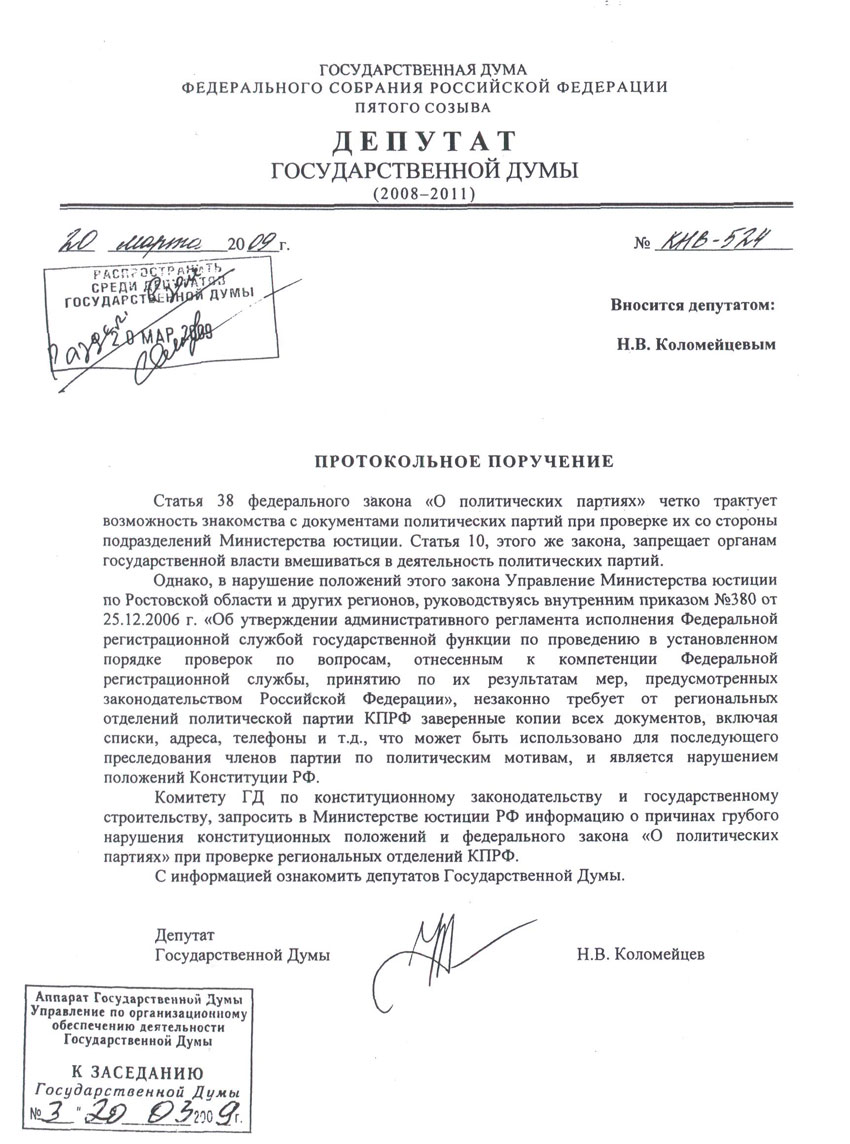 На заседании Госдумы 20 марта депутат-коммунист Н.В. Коломейцев поставил вопрос о грубых нарушениях, допускаемых Минюстом в ходе проверки региональных отделений КПРФ. Н.В. Коломейцев (фракция КПРФ). – Минюст нарушает статью 38 закона «О политических партиях», когда в ходе проверки отделений КПРФ его региональные управления начинают требовать копии всех документов, включая списки членов партии с адресами и телефонами. В связи с этим я прошу Комитет по конституционному законодательству и государственному строительству запросить в Минюсте информацию о причинах грубого нарушения конституционных положений федерального закона «О политических партиях» при проверке региональных отделений КПРФ. Источник: kprf.ru