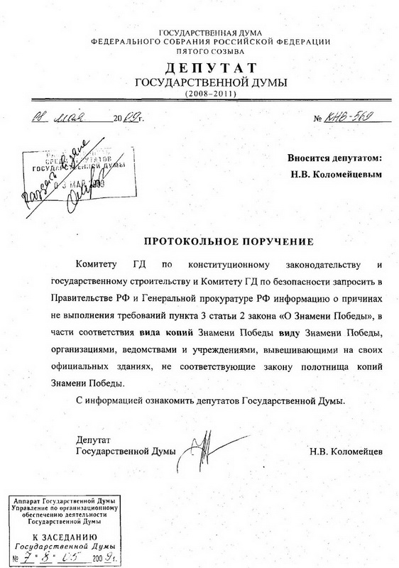 На пленарном заседании Государственной Думы 8 мая депутат-коммунист Н.В. Коломейцев потребовал проверить, на каком основании на официальных зданиях вывешиваются непонятные полотнища, вместо требуемых по Закону «О Знамени Победы».