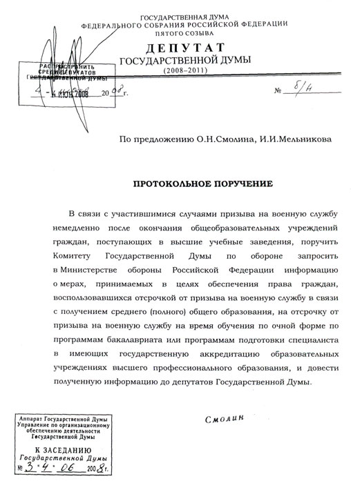 На пленарном заседании Госдумы 4 июня депутаты О.Н. Смолин и И.И. Мельников обратились с протокольным поручением к Комитету по обороне в связи с призывом на военную службу граждан, поступающих в высшие учебные заведения.