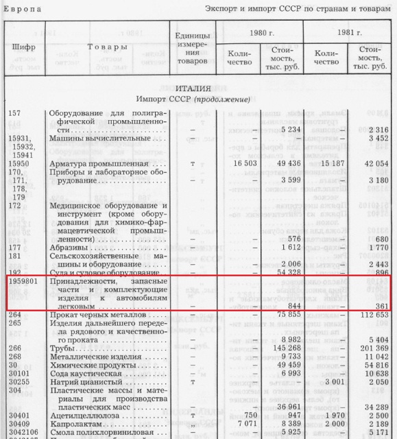1. Ну и где тут утверждение, что автомобили производились только из своих запчастей ? 2. И где тут утверждение, что выходившее из строя оборудование или модернизация оснастки производились только своими силами ? Страны, из которых СССР импортировал оборудование для заводов по производству автомобилей, 1980 и 1981 год : ![]() ГОСКОМСТАТ СССР, Справочник "Внешняя торговля СССР в 1981-м году". Тем, кто болен синдромом осаждённой крепости, советую обратить внимание на то, что импорт был даже из таких стран, как Австрия и Швейцария . А это импорт комплектующих для автомобилей из одной из стран - Италии, 1980 и 1981 год : ![]() ГОСКОМСТАТ СССР, Справочник "Внешняя торговля СССР в 1981-м году". А завод запустили запустили 9 лет назад .