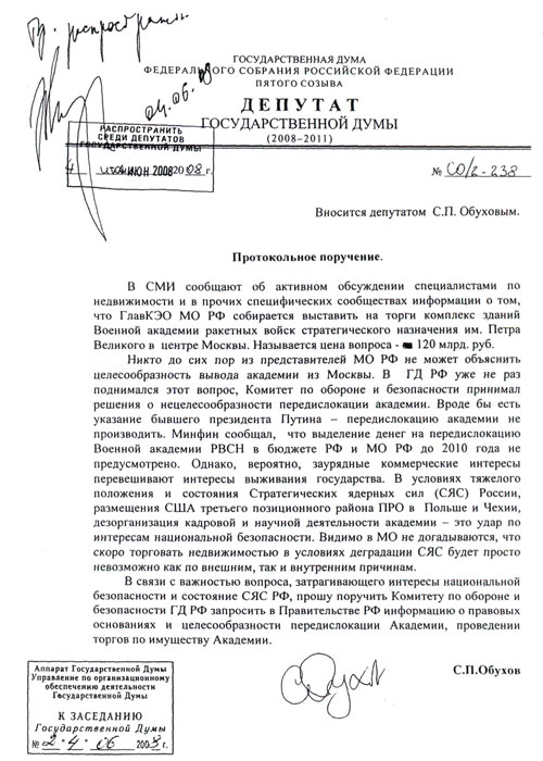 В связи с важностью вопроса, затрагивающего интересы национальной безопасности и состояние СЯС РФ, прошу поручить Комитету по обороне и безопасности ГД РФ запросить в Правительстве РФ информацию о правовых основаниях и целесообразности передислокации Академии, проведении торгов по имуществу Академии".