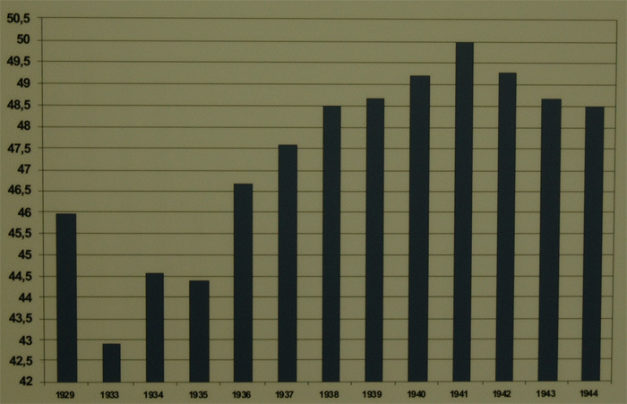 Посторонний Знаете , что сделали нацисты после прихода к власти ? - А они увеличили число рабочих часов в неделю более чем на 7 часов . Вот и всё . Отсюда и выплавка стали с чугуном ...