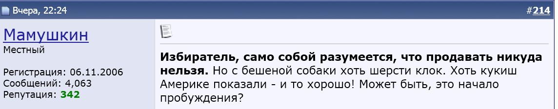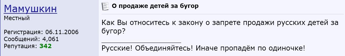 А термин "продажа детей" в этой теме я первым применил, а не совестливый Мамушкин... И радовался 80% проголосовавших за прокоррупционный закон избирательного действия (только против американцев) - тоже не Мамушкин? А может опрос в теме составлял тоже я (или там нет ни слова об Америке тоже)? Или голосовал в нем - не против усыновления за рубеж вообще, а против одних американцев? В конце концов, это не порядочный Мамушкин хамил мне неоднократно, а я ему ? Это я - ставил ему минус в репу - обвиняя во вранье, там где была чистая правда? Это я, наверное в разных форумах выступал под разными никами, а , господин Мамай.., а потом придирался к чужим никам ??? Вы думаете , если вам лично кажется, что вы человек чести, то это так и есть ??? Или вас трогает только то мнение, которое звучит в унисон с вашим? Да я против усыновления наших детей за рубеж вообще, и именно потому я против принятого закона о запрете усыновления детей американцами? И не потому, что американцы такие плохие (это дело десятое), а потому что наши дети - это Наши Дети... потому что детей нельзя использовать как разменную карту в политических игрищах... А для вас, неуважаемый, дети - повод покричать; как вы с соратниками о них заботитесь запрещая "продавать" в америку... А может надо просто положить свои силы на улучшение их жизни сегодня, а не в мифическом завтра, коль вы объединились в партию? А нет , так и молчите понурив голову, когда вам говорят правду о последствиях ваших поступков. Или вы из-за этого проворовского закона выступили против ошибки своих руководителей? Нет ... вы выступили против критики! |