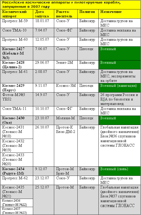 Таким образом, третья часть российских запусков идет на снабжение МКС, ещё одна треть – на развертывание глобальной навигационной системы ГЛОНАСС. Успешно выполнили задачи Космические войска России – в течение года запущено 5 различных спутников оборонного назначения. Однако группировка спутников прикладного назначения в 2007 году не пополнилась ни одним новым спутником вообще. Единственный научно-исследовательский аппарат «Фотон-М» №3, стартовавший в 2007 году для проведения экспериментов международных и зарубежных исследовательских коллективов, после завершения научной программы через 12 суток после старта был возвращен на Землю.