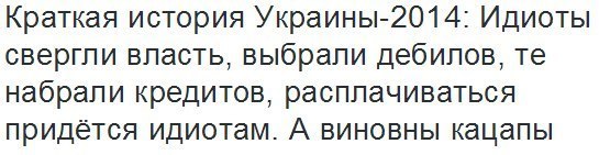 На удивление правдивую статью нашел на украинском сайте. Начало эпоса было про экономическую ситуацию в России. Укропитеков весьма расстроило, что рубль окреп и теперь мы не в полной опе, может еще и выкарабкаемся, кто знает? Но суть да дело, плавно перешли к прогнозам в своей стране, летящей с плакатами Бандеры в нежные руки Гейропы.Тут информация просто шокирующая, бандеровцы не живут иллюзиями, представляете? По данным специалистов макроэкономические показатели вынудят людей или эмигрировать (в Гейропу лучше, ждут уже давно, Путлер не дает) либо работать в другой стране (надеюсь не в Рашке у ватников, пусть учатся слово клозет на французский манер произносить). Самое интересное на западе бандеровцы уже ставят спектакли для детишек, в которых пират, редиска, пытается отобрать у них Укропию. Прототипом является, конечно же, диктатор Рашки. А теперь к конкретным цифрам, которые приводят финансовые аналитики Украины (Киевская газета). 1. Коммунальные платежи составят (браво, Яйценюх) 1500 украинских гривен ежемесячно (пример за 2-ку). 2. Причем средние зарплаты 1000-1200. Все надбавки в бюджетной сфере убирают, а это составляло 100% окладов. 3. На пенсию будут выходить в 62 года независимо от пола (что составляет среднюю продолжительность жизни в Окраине). 4. Темпы инфляции ускорятся, +20% по-прогнозу (правда так и не понял, на что еду покупать). 5. Падение доходов у населения составят 20-25%, а промышленного производства на 20. 6. Рост безработицы приведет к 16% майданутых. P.S. Так и хочется сказать: Скачите, хлопцы, вы же этого хотели! Перемога скоро! http://temydnya.mirtesen.ru/blog/433...ii-na-2015-god! |