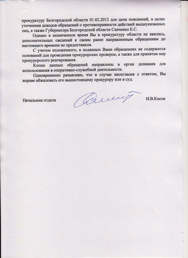 Корупция и беспредел forever , мною было получено письмо из Прокуратуры Белгородской области датированое 15-ым февралем 2013 года и подписаное Начальником отдела И.В.Косовым.. Письмо это есть точная копия ответа того же самого Косова датированого 10-ым январем сего года. Он снова мне пишет что не желает подавать иски в суд для изъятия роскошных коттеджей у известного криминального коррумпированого чиновника Белгородской администрации Полухина О.Н. и других корумпированых больших чиновников из губернаторской администрации Калашникова Н.В. Потрясаева В.Н. и самого губернатора Савченко Е.С.