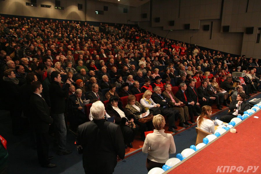 На экране – кадры хроники. Сначала мрачные времена царизма, затем – достижения Советской эпохи. Контраст разительный. Слово берет второй секретарь МГК КПРФ, лидер фракции коммунистов в Московской городской думе В.И. Лакеев. Он рассказывает биографию кандидата, подробно останавливается на его трудовом пути: от учителя сельской школы до лидера крупнейшей политической партии России. Затем слово предоставляется Г.А. Зюганову.