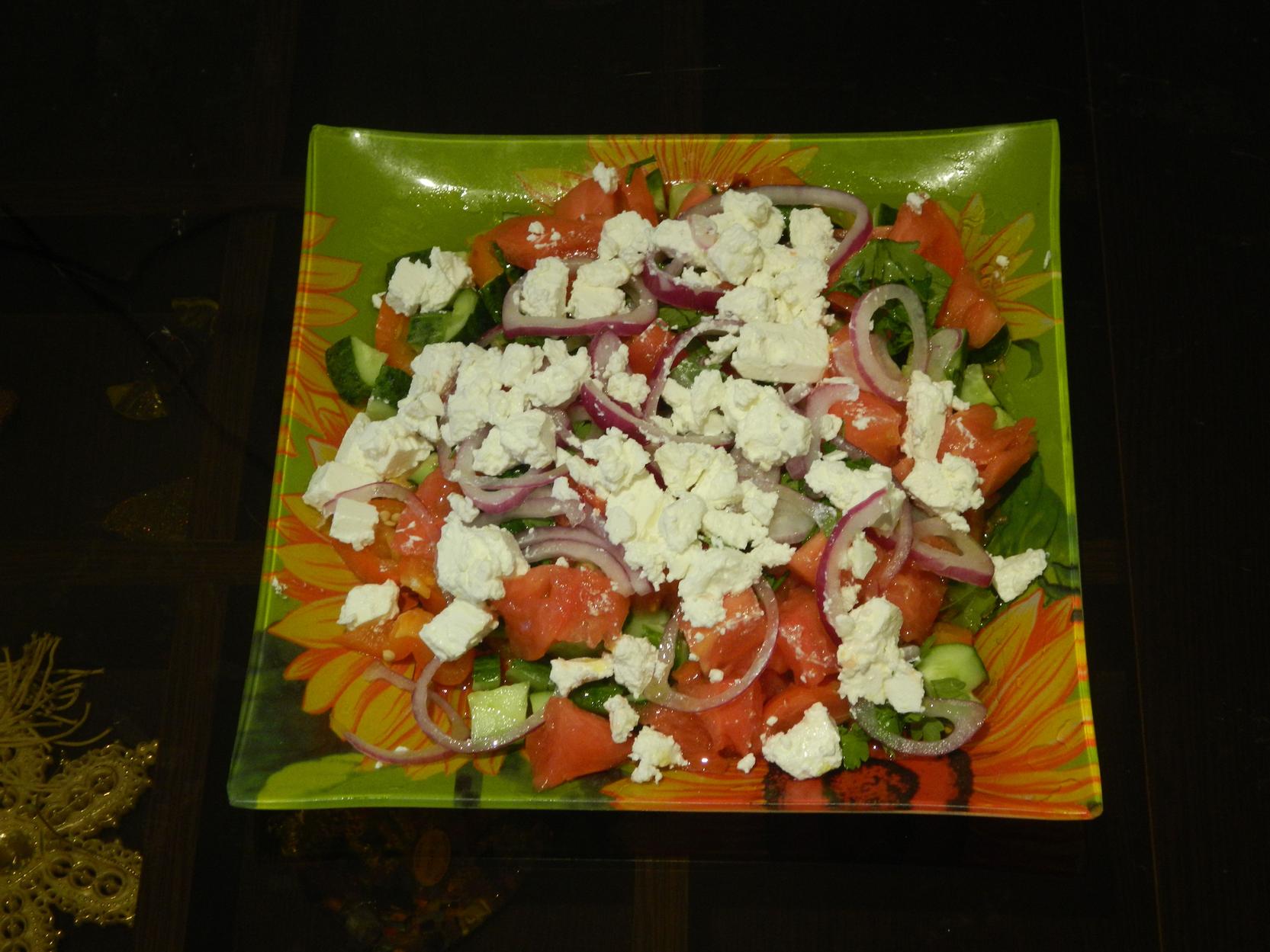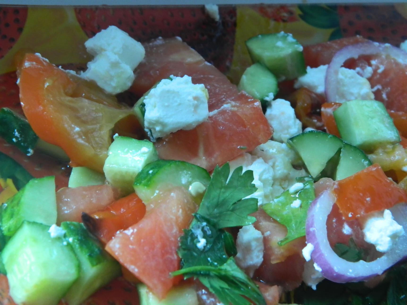 Самый мой первый рецепт - шопский салат. В 1977 году мы с родителями были в Болгарии, на мастер-классе (как сейчас говорят) болгарской кухни я запомнила именно его. С тех пор и готовлю. Он похож на греческий, но: Нет оливок (в Болгарии они не очень растут). перец обязательно печеный (20 минут в духовке, затем положить остужать в полиэтиленовый пакет и снять шкурку). Вместо сыра брынза. Помидоры, огурцы кубиками, лук (я его ошпариваю), петрушка, перец. Насчет заправки моя семья спорит до сих пор. Меня научили лить пару ложек оливкового. Однако, если нет оливок - откуда взяться соответствующему маслу? Поэтому как вариант растительное и уксус. Летом у нас очень хорошо идет. Для фотографии я сделала как положено. А могу заменить брынзу творогом, и лук не обязательно красный. |