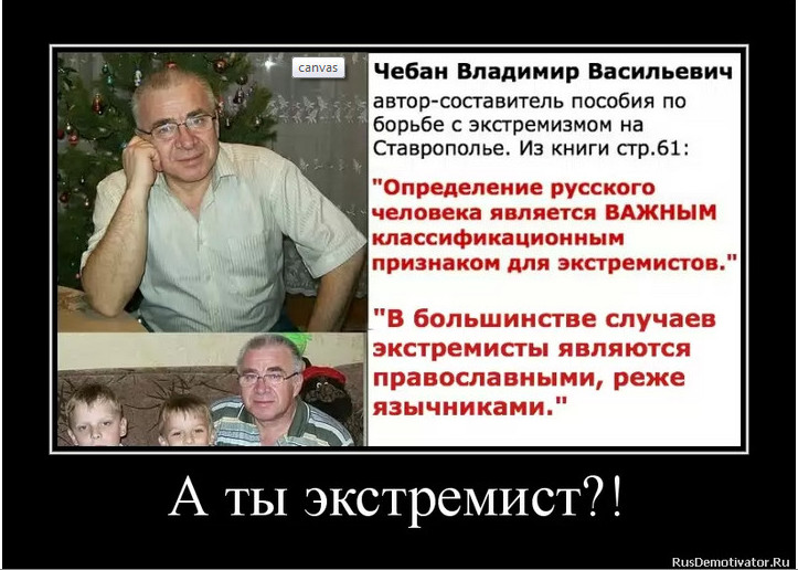 Итак, о пособии по борьбе с экстремизмом на Ставрополье уже рассказали по федеральному каналу НТВ http://www.youtube.com/watch?v=UuyJFEWzXJw ( с 18ой минуты), хотя ни этот, ни какой другой репортаж до тугих умов ставропольской власти не дойдет, наверно, они поймут только тогда, когда лишатся своего места у "кормушки". Автор - составитель этой "толерантной" книги, а также глава аппарата представительства Дагестана в Ставропольском крае (интересно, в Дагестане есть полпредство Ставрополья?) Чебан Владимир Васильевич, запомните это лицо и ФИО, так как именно он приписал в своей книжке к экстремистам всех русских, не упомянув при этом какие-либо другие национальности, умолчал также о тех, кто взрывает людей и готовит теракты. Я и мои друзья пытались культурно договориться с Чебаном об интервью на его странице в соц. сети Одноклассники, но он решил помолчать и ни на одно сообщение так и не ответил, что, в принципе, неудивительно, так как за свои слова и слова тех авторов-комментаторов, которых процитировал, он ответить не в состоянии. Я призываю всех, у кого есть страница в Одноклассниках, написать ему в личные сообщения "добрые пожелания" от русских "экстремистов", а так же можете написать сообщения его друзьям и родственникам, пусть знают кто он такой. Ссылка на его страницу http://www.odnoklassniki.ru/profile/374883200783 У кого есть другие подробности об этом существе, прошу писать мне в ЛС. А вообще, так называемое полпредство Дагестана в Ставропольском крае, уже неоднократно показывало свои явно русофобские настроения, так, полпред этой организации Абдулла Омаров заявлял, что лозунг "Исламизации - нет" является опасным для России, проводил на территории Ставрополья дагестанские праздники, теперь выяснилось, что и другой член этого общества является составителем сомнительной книжонки, призванной бороться с русскими. моё видео-обращение к властям http://www.youtube.com/watch?v=JDEVgGqZFOU Повторяю, что текст этой книги можете скачать по ссылке https://disk.yandex.ru/public/?hash=...071/EbZdR30%3D |