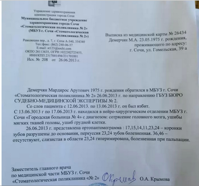 Врачи 4-й больницы отказались фиксировать другие травмы. Тогда Демерчян обратился в стоматологическую поликлинику №2, где врачи констатировали, что у Мардироса выбиты шесть зубов.