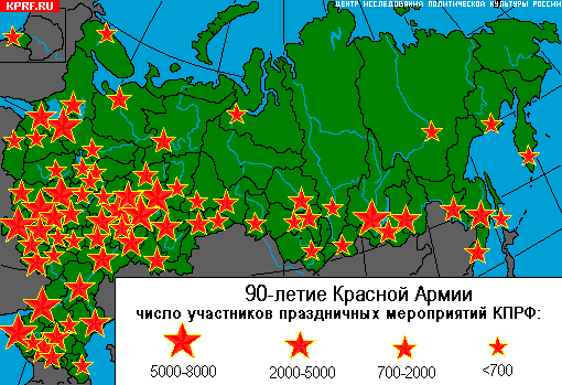«Нет развалу армии и флота!», «Зюганов – наш президент!» под такими лозунгами в 70 субъектах Российской Федерации прошли массовые акции в честь 90-летия Красной Армии. Хроника событий