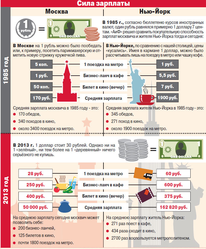 в 1985 году в СССР уровень жизни превышал американский почти в 10 раз но об это молчок . Есть статистика в этой картинке которую можете увидеть в самом внизу моего поста. Правда там не учитывается что в США в 1985 году средняя зарплата была на советские деньги 1900 рублей из них половина шла на аренду жилья или на выплату ипотеки . Далее 25% идет на выплату коммунальных услуг . Еще минимум 20% идет на выплату налогов и оплату медицинской страховки .То есть в итоге получаем такой расклад что Американец имел на руки всего не более 10% зарплаты то есть 190 рублей . Русский получал в среднем 170 рублей . И у него только высчитывали за коммунальные услуги и свет то есть не более 10 рублей . В итоге мы видим что у советского человека оставалось 160 рублей . У Американца 190 рублей . на жизнь . Но если сравнить с ценами по таблице то нужно у американца все поделить на 10. И в итоге видим по таблице . Американец на свою зарплату мог пообедать в столовой 34 раза . Советский человек на свою зарплату мог пообедать 170 раз минус 10% на коммунальные услуги то есть 153 раза . То есть разница тут выходит почти в 5 раз . Далее смотрим по таблице . Американец мог сходить в кино 27 раз . Советский человек мог сходить в кино 306 раз . Тут разница более чем в 10 раз . Далее смотрим по таблице и выводим Американец на свою зарплату мог проехать в метро 190 раз . Советский человек 3060 раз . Итого разница в 15 раз . Итак по еде советский человек питался в 5 раз лучше американца . Далее по культуру советский человек имел в 10 раз больше возможностей для культурного развития . Далее по передвижению советский человек имел в 15 раз больше возможности передвигаться чем американец . И выводим такие показатели . Средний житель СССР жил лучше среднего жителя СШа в 10 раз . Вот поэтому СССР решили развалить и нашли предателя Мишу заплатили огромные деньги . Иначе бы давно не было США . И планета земля была бы советская все уже лет 10 не менее . Но это не беда сейчас опять валится Америка . И она должна валиться потому что капитализм это система воровства .СШа воровали с помощью своих денег фантиков . Их навязывали и навязывают всему миру . Но сейчас Япония Китай РОссия страны Брик выходят из доларовой удавки . И переходят на свою валюту . И сШа рухнет уже очень скоро . Потому что почти вся промышленность перенесена из СШа в Китай и другие страны Азии И России . В СШа осталось селтское хозяйство и еще делают гражданские самолеты и все . Остальные канторы биржи вообщем жулики и воры . И сейчас долару уже никто не верит и поэтому СШа обречена . В мире восстановится совесткая власть а потом и коммунизм и это неизбежно и исторически доказано МАрксом Лениным Энгельсом и самой жизнью . |
