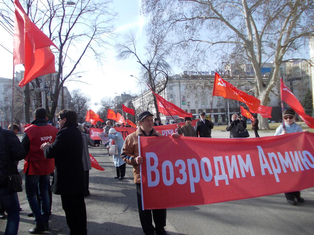 Сегодня состоялись митинги и демонстрации в ряде городов России, СССР. В том числе и в Краснодаре. Митинг и демонстрацию организовали КПРФ и Союз Советских Офицеров Кубани. Торжественно прошли по ул Красной, через весь центр города, возложили цветы. Дошли до Вечного Огня где состоялся митинг посвященный дню Советской Армии и ВМФ. Осудили безобразия "майданщиков" на Украине и вмешательство запада, америки в дела Украины, провоцирование беспорядков. Выступили за возрождение Российской армии и флота. Было более ста человек. Борьба с нечистью продолжается. Верные Идеям Социализма поддерживают традиции, сознание, наработки на должном уровне. |