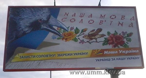 Когда у нас на Украине ввели закон о русском языке, наши нацисты развесили биллборды с таким рисунком - украинская вышивынка, на ней маленький беззащитный соловейчик, над ним огромная злая ворона хочет его заклевать. Надпись на плакатах "ЗАХИСТИ СОЛОВЬЇНУ", т.е. "Защити соловьиную", т.е. мову, язык по-русски. Стало быть противная ворона - это гадкий москальский грубый и каркающий язык. А что, собственно, такое украинский язык? Смесь древнерусского наречия с польским, немецким и турецким, плюс фактор времени. Например, "исконно" украинские слова цегла(кирпич), цыбуля(лук), дах(крыша), гак(крюк), мусыты(быть обязанным) и др. - немецкие - ziegel, zwiebel, dach, hacken, mussen. Буква "Г" с придыханием - тоже из немецкого, характерные украинские окончания - польскизмы.