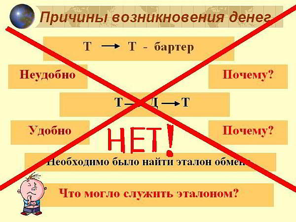 Выцапала из интернета одну из "презентаций" то ли преподавателя, то ли студента на тему "Причины возникновения денег". Показательный образет того, как в курсе "Макроэкономика", даже портрет Маркса и упоминание его теории не спасает от грубейших искажений в разъяснении истории возникновения денег. Нарисовав схему бартера, препод ставит вопрос: удобно или неудобно. Формы ради просит объяснить, почему. Мой встречный вопрос: а кому именно, по мнению препода, "удобно" или "неудобно"? И даже если кому-то "неудобно" вместо того, чтобы одним махом, топор на овцу, с деньгами таскаться - то что он сможет поделать? Суда по правам человека нет, чтобы жаловаться. Чушь! Или что - если островитяне вывели на берег корову, а им купец вместо мешков зерна самородок, и говорят, что "так нам удобно" - что, согласятся ли они взять "вместо хлеба камень" (как в писании)? Или сами выйдут в море искать другого торгового партнёра, у которого хлеб можно выменять напрямую, без посредника, "слишком требовательного к удобствам"? Все эти вымыслы в терминах "удобно - не удобно" оторваны от исторической реальности. В которой если чей интерес "удобств" и принимается в первоочередном порядке, то это интерес коллективный в высшей его форме государственного интереса. Следующая строка слайда "необходимо было найти эталон обмена"... Просто диву даюсь, как себе этот препод представлял себе это в натуре. Международная конференция? Плебисцит? Война "золотых" с "серебряными"? Чушь, бред... до чего докатилась наша вузовская наука, взяв на вооружение "удобную" для них систему слайдов с заранее разжёванными решениями. Причём идиотскими, как в этом случае. Вместо того, чтобы, уж если хочется вопросов-ответов и прочего интерактива, то обсудить всё это вживую на семинаре... Бедная наша страна! Бедные её новые поколения студентов-недоучек, и кадавров-бакалавров.... ...Да и система обозначений у автора, если приглядеться, не марксова! Вместо (Т - Т') и (Т - Д - Т') он пишет без штриха (Т - Т) и (Т - Д - Т). Скрывает даже намёк на существование прибавочнго продукта и стоимости! |