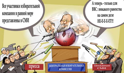 Сначала г-н Чуров для Би-би-си, наконец, признал, что условия для кандидатов в президенты России в ходе предвыборной кампании были неравными. В интервью Би-би-си председатель ЦИК оказался вынужден заявить, пусть и витиевато: неравенство заключалось в том, что "не все кандидаты фигурировали в одинаковом числе новостных сообщений".