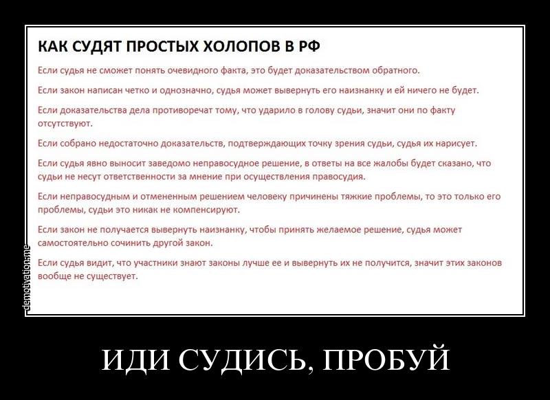 = Не знаю как при Советской власти, а в РФ следователи вовсю фабрикуют уголовные дела с заведомо ложными обвинениями, лишают подследственного реальной защиты. Сейчас УПК требует от судьи и следователя вести дело не беспристрастно, не объективно, а "на основе своего внутреннего убеждения". Судья дозволяет на суде вот что: "Говорите только о своём преступлении!" Аргументы в оправдание - не принимаются. Ещё я знаю, что погрешность (нейтронных) датчиков влажности хлопка - аж несколько %, лучше пока никак. Хлопок собирали миллионами тонн. Тут открывается широкое поле как для "законных хищений", так и для уголовных дел ни о чём ("усушка"), так и для приписок (увлажнение). Так что я сильно сомневаюсь насчёт объективности расследования Гдляна и Иванова. Не верю я им. Ещё больше не верю, что Лигачёв брал взятку. Подробности о современных судах - в чьей-то иллюстрации (из сетки).