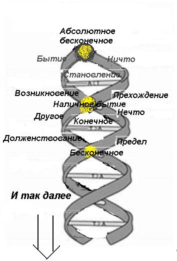Пересечение только при превращении пространственного образа спиралей ДНК в плоскостное. Поэтому образ ДНК для отражения логической структуры логики вряд ли подходит. Если Мы изменим сторону взгляда на спирали ДНК , то узел сместится в верх или вниз. При таком изменении , вообще можно сбросить часть логической структуры. К примеру может исчезнуть моменты становления: прохождение и возникновение.. Есть ли комментарий спирали ДНК от МИБа я не знаю(ниже не читал). Это мой первый взгляд на образ. Может в физике есть более адекватный образ. Чувствую, что двойная спираль есть та же дуплекс-сфера ( вывернутый тор/бублик), бутылка Клейна ( вывернутая бутылка), даже лента Мёбиуса наверное больше подходит, если её свернуть с несколькими узлами, а не только 8. Но для меня образ с двойной спиралью в логике по аналогии с двойной сприалью ДНК остаётся открытым. Есть ещё три спирали биоритмов человека ( физический, психологический умственный) но там спирали просто смещены в зависимости от периода (продолжительности цикла). Что то похожее было в учебнике по физике, но я забыл (Женя напомнит). Про математику молчу, она наверное имеет море этих спиралей. Понятно, что это не выдумка , а двойная спираль образ эволюции энтропия и негэнтропийный процесс. Последний раз редактировалось Леонид Санталов; 16.04.2015 в 11:30. |