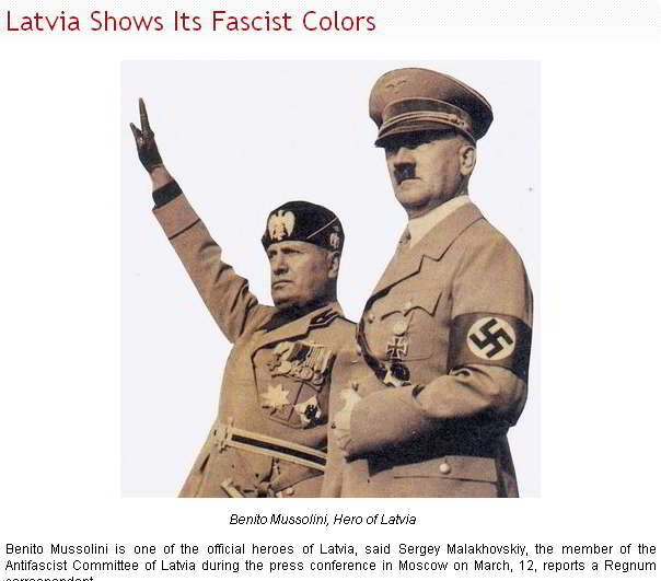 Бенито Муссолини в 1928 году стал кавалером высшей награды буржуазной Латвии — ордена Лачплесиса I степени. (Как и Пилсудский, замечу, тоже) Новые латышские нацики использовали это как повод увековечить память дуче на мемориальной доске на Братском кладбище в Риге. И теперь иностранные дипломаты оказываются в двойственном положении каждое 11 ноября при ежегодном возложении венков. http://www.regnum.ru/english/litva/1081718.html