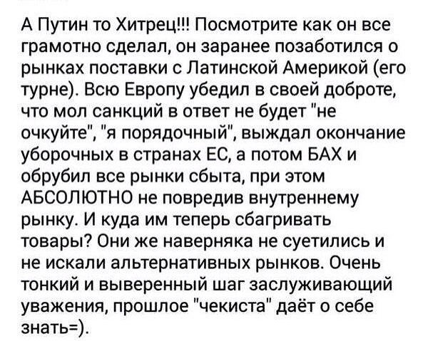 Неужели стоило ждать санкций, чтобы поддержать собственное сельское хозяйство?! Коммунисты два десятка лет твердят о том, что средства, направляемые на закупку сельхозпродукции за бугром, следует вкладывать в своё село и, тем самым, позаботиться о продовольственной безопасности России. Путина санкции заставили обратить внимание на отечественного сельхозпроизводителя (надолго ли?), а мы уже готовы его в задницу расцеловать за это. И уже забыли, что именно Путин, начиная с 1999 года, продолжал ельцинскую политику, направленную на удушение села. Короткая же у нас память.