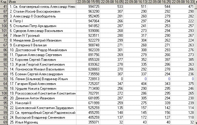 У остальных по 1-2 голоса, половина кандидатов вообще без голосов, хотя им это не помешало набрать почти по миллиону голосов на основном проекте, например Екатерина II, Менделев и т.д.