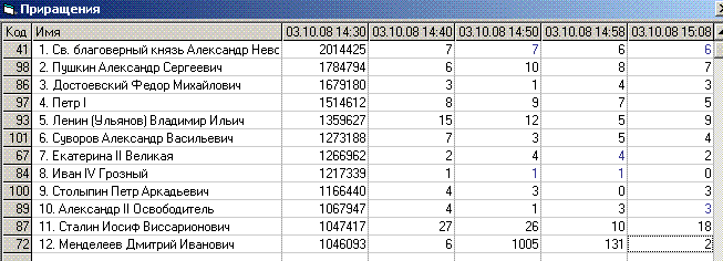 1 Св. благоверный князь Александр Невский 2 014 038 2 Пушкин Александр Сергеевич 1 784 321 3 Достоевский Федор Михайлович 1 678 985 4 Петр I 1 514 098 5 Ленин (Ульянов) Владимир Ильич 1 359 088 6 Суворов Александр Васильевич 1 272 892 7 Екатерина II Великая 1 266 762 8 Иван IV Грозный 1 217 258 9 Столыпин Петр Аркадьевич 1 166 261 10 Александр II Oсвободитель 1 067 767 11 Сталин Иосиф Виссарионович 1 046 114 12 Менделеев Дмитрий Иванович 1 045 845 а последние 23 часа было засчитано 5 998 голосов. Сталин получил из них 1 870 голосов и поднялся на строчку вверх! Ленин набрал 804 голоса. Невский набрал 523 голоса, а Столыпин например 216. Сегодня на сайте Имя Россия счётчик зафиксировал чуть меньше посетителей 6700.