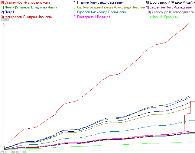 1 Св. благоверный князь Александр Невский 2 014 575 2 Пушкин Александр Сергеевич 1 784 981 3 Достоевский Федор Михайлович 1 679 243 4 Петр I 1 514 824 5 Ленин (Ульянов) Владимир Ильич 1 359 818 6 Суворов Александр Васильевич 1 273 285 7 Екатерина II Великая 1 267 025 8 Иван IV Грозный 1 217 354 9 Столыпин Петр Аркадьевич 1 166 478 10 Александр II Oсвободитель 1 067 996 11 Менделеев Дмитрий Иванович 1 048 068 12 Сталин Иосиф Виссарионович 1 047 797 За последние 3 часа 30 минут, насчитали 1510 голосов, из них Менделеев получил больше половины 809. Менделеев опять резко скаканул и переместился на 11 места, Сталина отодвинули на 12 место. В общем стали накручивать Менделееву. P.S. На сайте написано что голосование должны были в 22-00 остановить, в это время не видел, так что возможно выше сказанное случилось за 1 час 50 минут, а скорей всего вброс был таким же быстрым как в данных от Ефремов что ещё больше впечатляет в качестве накрутки Менделееву
