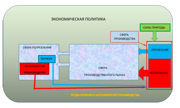 Вероятно, Путин знает, как изменять ход событий. У него в помощниках сильных экономистов и политиков больше, чем у Обамы. Не объявляя ни о чем, Путин переставляет местами политэкономию и НЭП. Вероятно, ему известно и о том, чем производственный рынок отличается от капиталистического рынка. Но поживем, то и увидим. Ну, а мне необходимо схематично показать сферу производственного рынка, сферу производства и сферу потребления производителей. Сфера производства при экономической политике требует в себе двух частей. Одна часть – это исполнители производства. Другая – это управляющие производства. Мной ни слова, здесь, не говорится о политической экономии СССР. Речь только об экономической политике. Можно сказать, о НЭП. Но схема для всех политических политик одна и та же. И легка в образной аналогии с проточным рукотворным бассейном. Бассейн олицетворяет рынок производителей или просто рынок производства. Источником для наполнения для наполнения этого рынка служит производство. Источником для производства является труды исполнителей и управленцев производства. Управленцев допустимо именовать буржуями, помещиками, как угодно. Любая терминология ничего не меняет в данной схеме. Труды производителей в дополнение наполняются затратами сил природы. Именно из этого исходил Ленин, объявляя НЭП и осуществляя план ГОЭЛРО. У рынка производителей, как и у проточного рукотворного бассейна, есть особенность «сколько в него втекает, столько и утекает». Говорят, что управленцы или буржуи, это антагонизмы. Но этот антагонизм имеет место в жизни, когда появляются деньги воров. Поэтому, прежде чем говорить о производственных или трудовых деньгах, необходимо посмотреть на деньги воров. При НЭП легко находится и производительность труда людей, но, сначала, надо посмотреть, как деньги воров всё испортили.