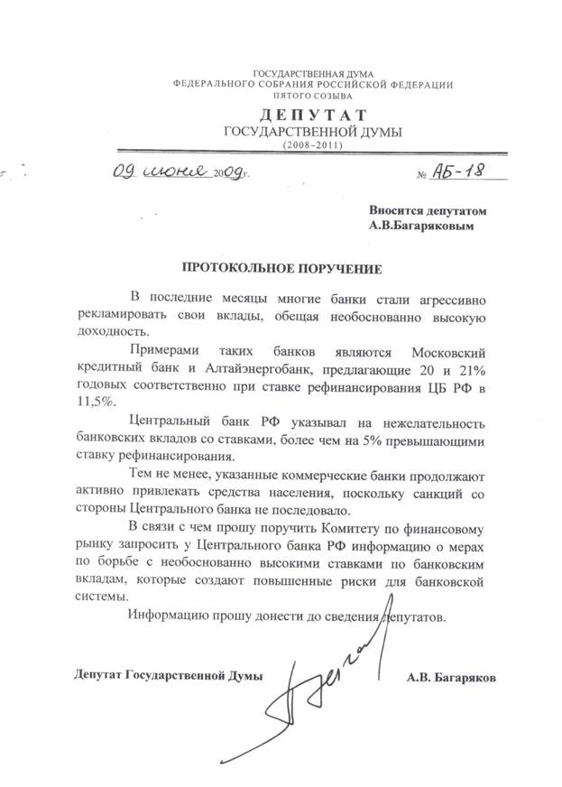 Сегодня на Пленарном заседании Государственной Думы депутат А. Багаряков потребовал поручить Комитету по финансовому рынку запросить у Центрального Банка РФ информацию о мерах по борьбе с необоснованно высокими ставками по банковским вкладам, которые создают повышенные риски для банковской системы. "В последнее время много говорится о том, что предприятиям как воздух необходимы доступные кредиты. В то же время многие банки стали агрессивно рекламировать свои вклады, обещая невиданные прибыли. Доходность по таким вкладам доходит до 20-21% годовых. О каком оживлении кредитования при таких ставках может идти речь?! Более того, допуская подобные вольности, эти банки создают повышенные риски для всей банковской системы". Источник: kprf.ru