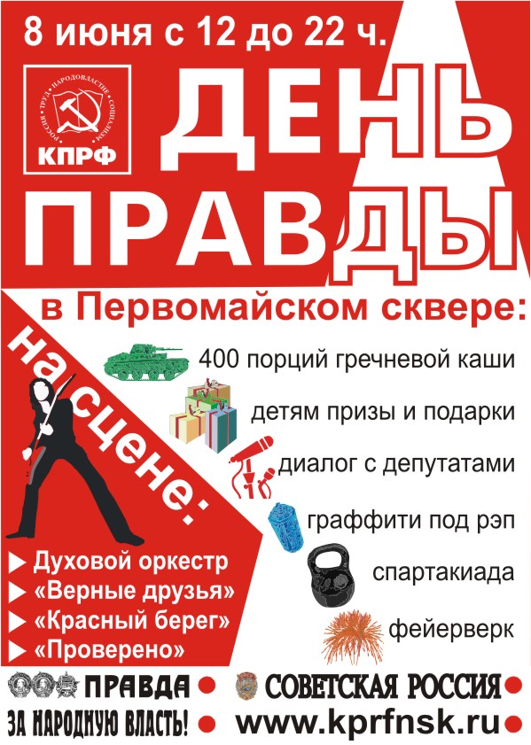 2 июня в областном комитете КПРФ прошла пресс-конференция лидера новосибирских коммунистов Анатолия Локтя, посвященная предстоящему фестивалю левой прессы «День Правды». Фестиваль пройдет 8 июня в Первомайском сквере, который на целый день превратится в центр политической и культурной жизни столицы Сибири. Горожане смогут принять участие в политических дебатах и пообщаться с депутатами в нашем сибирском «Гайд-парке», поборются за призы в ходе спортивных соревнованиях, послушают музыку и просто отдохнут от городской суеты. Программа рассчитана на весь день и на любого возраста и интересов. По словам первого секретаря Новосибирского обкома КПРФ Анатолия Локтя, решение о проведении мероприятия принято на бюро обкома. По замыслу организаторов фестиваль — это несколько тематических площадок. На площадке левой прессы пройдут презентации оппозиционных СМИ, встречи с депутатами и жаркие политические дебаты. На музыкальной сцене выступят духовой оркестр, ансамбль «Верные друзья», а ближе к вечеру музыкальные группы «Красный берег», «2+1» и «Проверено». Спортивная площадка «Комплекс ГТО» подразумевает участие новосибирцев в различных спортивных состязаниях: тир, перетягивание каната, шахматные турнир, дартс, поднятие гири и многое другое. На площадке «Служу Советскому Союзу!» будут выставлены военная ретро-техника, а желающие смогут вспомнить армейскую молодость, собрав и разобрав на скорость автомат Калашникова. На молодежной площадке Союз коммунистической молодежи и неформальная молодежь организуют конкурс графитчиков и рэп-команд. А на детской самых молодых горожан будут развлекать пионервожатые. На каждой из площадок участники будут получать красные звездочки, за которые смогут отведать солдатскую кашу, квас или получить ценный приз. Начнется фестиваль в 12 часов дня, а закончится вечером — в 22.00. «Этим самым мы хотим продемонстрировать свою открытость, свою доступность, сломать существующие стереотипы и доказать, что коммунисты — это открытые и современные люди, — подчеркнул Анатолий Локоть. — Это наш политический вызов тем мероприятиям, проводимыми официальными властями, которые в итоге скатываются в поддержку только одной политической силы. Мы знакомим горожан с нашей прессой и тем самым открываем политическое лето в Новосибирске». Источник: kprf.ru