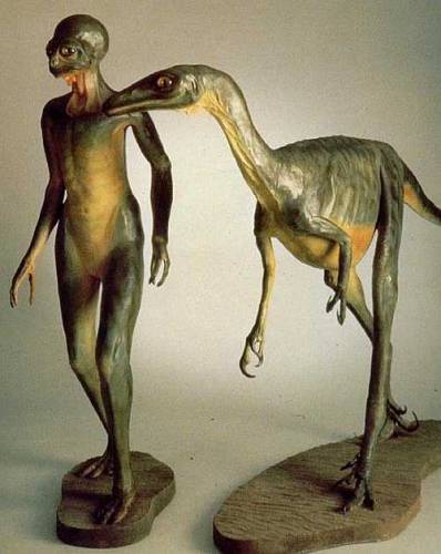 Этот вид считают разумными динозаврами. Предполагают, что они могли думать, совместно охотиться, передними конечностями хватать и кидать камни. И если бы не "маленький" экологический инцидент, эти рептилии научилась бы со временем водить автомобили и строить небоскребы. На гуманоидную внешность стенонихозавра первым в 70-е годы прошлого века обратил внимание канадский палеонтолог Дейл Рассел. И пользуясь законами эволюции, расчитал, как бы мог выглядеть динозавр разумный, если бы реализовал заложенные в нем основы. Получилось существо, которое коллеги назвали динозавроидом (di sapiens), - представитель расы разумных ящеров. Так мог выглядеть "Диносаписенс" (Динозавр разумный) - Ящеры были теплокровными, - добавляет Дейл Рассел. - Недавно мы нашли окаменевшее сердце одного из них. Сердце - четырехкамерное, как у человека и других теплокровных существ. Другой "гуманоидоподобный" динозавр - заврорнитоид. Впервые был описан в 1924 году Генри Феирфилдом Осборном по остаткам неполного скелета, обнаруженного знаменитой Центрально-азиатской экспедицией Американского музея естественной истории. Заврорнитоид был длиной 2 метра и весил от 27 до 45 килограммов. Некоторые палеонтологи считают, что на самом деле стенонихозавр и заврорнитоид относятся к одному роду и даже одному и тому же виду. Заврорнитоид был хищником. Он убивали своих жертв когтями задних ног. Заврорнитоидиды, по-видимому, были группой самых смышленых и при этом похожих на птиц динозавров. Размер их мозга, судя по всему, свидетельствует о том, что они были почти так же умны, как и современные эму, и определенно сообразительней нынешних пресмыкающихся. Такая степень развития мозга служила им для координации действий во время охоты, особенно когда они охотились в сумерках на мелких активных животных, таких как мезозойские млекопитающие. Это также означало, что они могли заботиться о своем потомстве, выпасая выводки детенышей, как сегодня это делают страусы и эму. У заврорнитоидид когти на ногах были не такими большими, зато хвост был гибким, а скелет сильно облегченным, как и у других мелких хищных динозавров. Заврорнитоид и родственные ему динозавры, вероятнее всего, охотились в сумерках на мелких млекопитающих. Полный скелет заврорнитоида пока еще не обнаружен, а первые найденные его останки были представлены черепом, тазом, частями позвоночника и конечностями. Этого оказалось достаточно, чтобы понять, как выглядело животное. Огромные глаза заврорнитоида были широко посажены и могли смотреть вперед подобно глазам совы: ящер обладал стереоскопическим зрением. По сравнению с другими он обладал очень большим мозгом. Рот насчитывал много зубов, имевших по краям пилообразную насечку. - Они болели раком, словно люди, что возможно, в итоге их погубило, - говорит еще об одном сходстве "старших братьев по разуму" с нами Брюс Ротшильд из Северо-Восточного университетского медицинского колледжа. Он изучил странно измененные кости некоторых видов динозавров и пришел к такому поразительному выводу. Правда, это лишь версия. Возможно, "разумные динозавры" исчезли вместе со своими остальными собратьями 65 миллионов лет назад, когда Земля столкнулась с гиганским метеоритом, или же их погубило нечто иное.. Массовое заболевание раком? Что может вызвать такое заболевание? Или кто? Ответ - радиоак