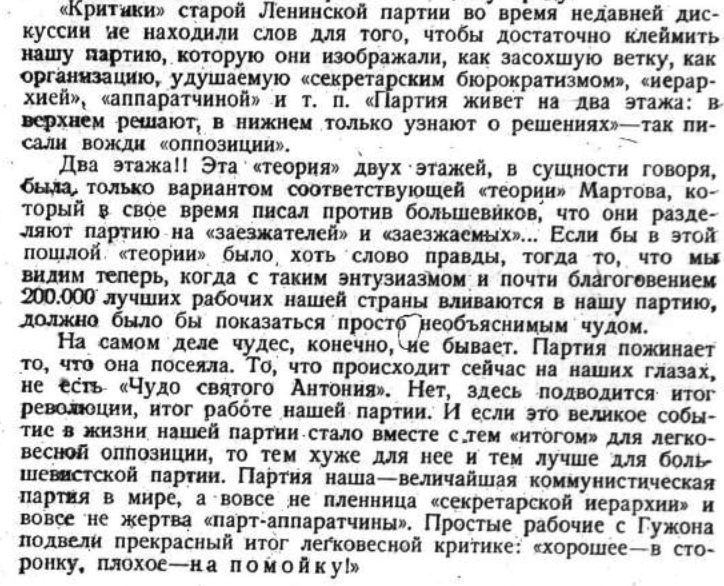 О призыве 200 тысяч рабочих в партию для направления на руководящую партийную и хозяйственную работу. Зиновьев считает в цитируемой статье, что Ленинским призывом весны 1924 года был подведен итог революции. Вывод о том, что Ленинским призывом подведен своего рода промежуточный итог революционной эпохи, представляется имеющим основание, так как Зиновьев, будучи в 1924 году одним из руководителей Союза ССР, ни словом не обмолвился в своей статье о Советах - школе коммунизма. ![]() ![]()