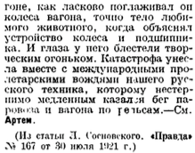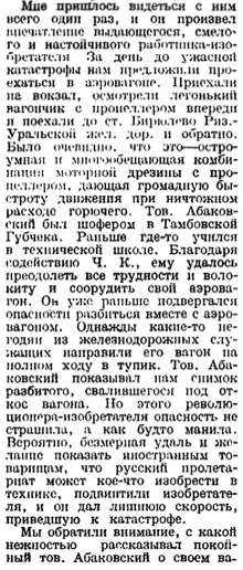 https://topwar.ru/68705-aerovagon-ko...akovskogo.html Ключевые понятия: пробили изобретение сквозь волокиту; разработка прекращена после первой аварии Всего через пару лет после появления немецкого проекта самоходного вагона с авиационной силовой установкой Dringos за авторством Отто Штайница аналогичная техника была создана и в нашей стране. Оригинальная идея строительства железнодорожного вагона, оснащенного авиационным двигателем и воздушным винтом, сулила массу преимуществ, главным из которых была высокая скорость. В зависимости от конструкции и используемой силовой установки такой транспорт мог разгоняться до 120-150 км/ч, что в те времена считалось почти невозможным. В 1921 году свой проект подобного вагона представил инженер-самоучка Валериан Иванович Абаковский. ![]() Аэровагон конструктора В.И. Абаковского С 1919 года Абаковский служил шофером в Чрезвычайной комиссии города Тамбова. Будущий создатель т.н. аэровагона проявлял большой интерес к различной технике, в том числе к перспективным проектам. Такой интерес в сочетании с желанием принести пользу своей стране и народу привел к появлению любопытного подтверждения. Неизвестно, знал ли Абаковский о работах Штайница или пришел к оригинальной идее самостоятельно, но, так или иначе, в 1921 году появилось предложение построить новое транспортное средство для железных дорог. Главным преимуществом предложенного аэровагона (этот термин появился именно для обозначения машины В.И. Абаковского) перед всеми существующими видами транспорта, за исключением самолетов, была высокая скорость передвижения. При определенных условиях эта машина могла бы развивать скорость более 100 км/ч, что позволяло сравнительно быстро преодолевать большие расстояния, свойственные географии РСФСР. Так, аэровагон мог бы использоваться для обеспечения перевозки различных государственных документов на линиях, соединяющих Москву и удаленные города. Кроме того, он мог быть транспортом для высокопоставленных лиц, экономя их время и позволяя быстрее приступать к своим обязанностям в регионах. В.И. Абаковский отправил свое предложение руководству молодого советского государства и получил поддержку. Весной 1921 года стартовало строительство перспективной машины. По одним данным, аэровагон строили в Тамбове, по другим – в Москве. К лету того же года начались испытания нового образца техники. Тестовые заезды проводились на имеющихся железнодорожных перегонах в центральных районах страны. К середине июля 21-го аэровагон преодолел более 3 тыс километров и показал высокие характеристики скорости. Конструкция аэровагона Абаковского была максимально упрощена и облегчена для достижения высокой скорости. Машина имела ходовую часть с двумя колесными парами, тормозами и другими агрегатами, заимствованными у существовавшей в то время железнодорожной техники. На раме аэровагона смонтировали кабину характерной угловатой формы. В своей передней части она имела клиновидную форму, призванную обеспечивать приемлемую обтекаемость, а средняя и задняя части кабины были прямоугольными. Кроме того, для улучшения аэродинамики передняя часть крыши была выполнена скошенной. Все агрегаты силовой установки аэровагона располагались в его передней части. Машина получила авиационный двигатель (модель и мощность неизвестны), который установи