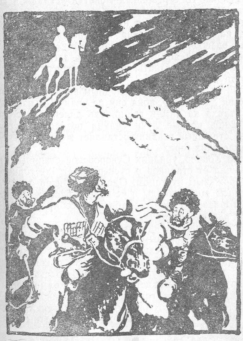 ШАЙТАН МИХЕЙ На притоке Кубани – Хопре – живут русские казаки. Близ станицы Суворовской высится Сторожевой курган, на горизонте маячат горы Бештау и Машук. От джигита к джигиту передавалась старинная легенда, как один джигит предал другого, отважного воина, и получил за своё предательство лучшего коня, 30 серебряных монет и ускакал в горы. И с тех пор белая тень убитого воина иногда появляется на Сторожевом кургане, в мареве степной жары растёт до великанских размеров, нагоняет путников и заглядывает им в лицо, ища своего предателя, вея холодом и скорой смертью, и охваченные безумным ужасом путники и кони скачут прочь, пытаясь убежать от призрака, и, обессилев, падают на камни при дороге ... Настали 70-е годы 18-го века. Англия натравливала Турцию на Россию, Турция мечтала оторвать у России Крым и подстрекала ногайцев, черкесов, лезгинов и чеченов грабить и убивать жителей казачьих станиц. Однажды урядник Суворовской станицы Михей Хопров отвозил пакет от станичного атамана, на обратном пути напал на удачную охоту и после неё уснул невдалеке от кургана. Проснулся лишь тогда, когда в небе ясном уже и вечерняя заря догорала. Видит: по берегу реки скачут от дикой степи всадники. Чеченцы. Их отряд разделился на два – 15 всадников понёсся рысью по дороге, остальные – выслушали предводителя и двинулись в сторону станицы. Как обычно – желая убивать и грабить ... А на степь уже накатили сумерки, поплыл туман ... Не таков был Михей, чтобы отсиживаться в кустах. В тот день он был в белой черкеске и папахе, на белом коне. Озарённый бликами вечерней зари, он на коне встал, как вкопанный, на вершине кургана. Чеченцы с гиканьем неслись по степи к станице. Вдруг у одного конь споткнулся и шарахнулся в сторону. Его всадник заметил белого призрака заоблачных размеров на кургане. "Шайтан!" И банда повернула прочь в суеверном страхе. Михей со свистом и гиканьем слетел на коне с кургана и, подняв над головой нагайку, помчался за утекающими. Чечены не боялись ни пули, ни шашки, ни кинжала – но тут за ними гналась сама смерть, сам шайтан, белый призрак на белом коне, безжалостный древний мститель за предательство ... Один отряд "храбрых" чеченцев с ходу смешался с другим, все они доскакали до берега и прыгнули на конях с кручи в холодные воды горной реки. Следом на кручу вылетел Михей, поднялся на стременах и завыл шакалом. Абреки скрылись в камышах на противоположном берегу. Михею достались трофеи – ружьё и две чёрных папахи. Всё это произошло на глазах у дозорной пары станичных казаков. |