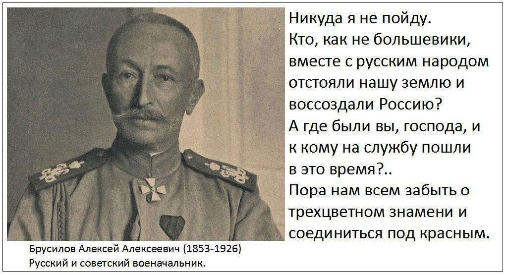 С 17 марта 1916 года — главнокомандующий армиями Юго-Западного фронта. "В июне 1916 года провёл успешное наступление Юго-Западного фронта, применив при этом неизвестную ранее форму прорыва позиционного фронта, заключавшуюся в одновременном наступлении всех армий. Главный удар был намечен на участке одной из четырёх армий, входивших в состав фронта, но подготовка велась во всех четырёх армиях и при том по всему фронту каждой из них. Основная идея обмана — заставить противника ожидать атаки на всем протяжении фронта и этим лишить его возможности угадать место действительного удара и принять своевременные меры к его отражению. По всему фронту, растянувшемуся на несколько сот километров, рыли окопы, ходы сообщения, пулемётные гнезда, строили убежища и склады, прокладывали дороги, сооружали артиллерийские позиции. О месте действительного удара знали только командующие армиями." (Википедия) Верховный главнокомандующий Русской армии (22 мая — 19 июля 1917). "С 1920 года в Красной армии. С мая 1920 года возглавлял Особое совещание при главнокомандующем всеми вооружёнными силами Советской Республики, вырабатывавшее рекомендации по укреплению Красной армии. В сентябре 1920 года совместно с М. И. Калининым, В. И. Лениным, Л. Д. Троцким и С. С. Каменевым подписал воззвание к офицерам армии барона Врангеля. В воззвании содержался призыв к прекращению Гражданской войны и гарантировалась амнистия всем, переходящим на сторону советской власти" (Википедия) С 1924 года состоял при Реввоенсовете для особо важных поручений. Похоронен со всеми воинскими почестями у стен Смоленского собора Новодевичьего монастыря. "Кто, как не большевики, вместе с русским народом отстояли нашу землю и возродили Россию? А где были вы, господа, и к кому на службу пошли в это время? Пора нам всем забыть о трёхцветном знамени и соединиться под красным !"