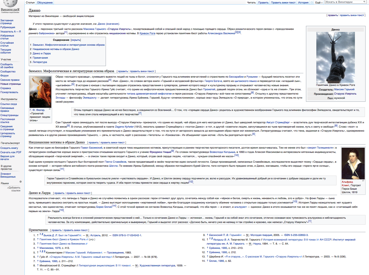 Случайно обнаружил такую вот такую статью о горьковском Данко в уважаемой мной Википедии, из которой читатель узнает только три вещи: образ мифологический, создан под влиянием Ницше, сближается с образом самовлюбленного Ларры. При этом вскользь признается, что такая трактовка противоречит установившейся трактовке образа Данко, отдавшего свое сердце людям. Нет ни слова о творческих поисках величайшего пролетарского писателя положительного реалистического образа героя, который действует в коллективистском контексте. Хотя конец 19 века и был временем повальной моды на ницшеанского героя-индивидуалиста, Евгения Онегина с бомбой, у Горького никогда не было подобных сюрреалистических образов. И к образу Павла Власова он пришел, не ломая свое коллективистское видение мира, а развив его, начиная, в том числе и с образа Данко. Позиция, выраженная в Википедии - очень серьезное и опасное извращение не только творчества великого пролетарского писателя, но и дорогого образа сказочного героя Данко. Если у кого-то есть умения, силы и время на исправление этой статьи, займитесь, сделаете великое дело. Простое замечание/исправление от неизвестных личностей стряхивается русскоязычной модерацией Википедии, как пылинка.