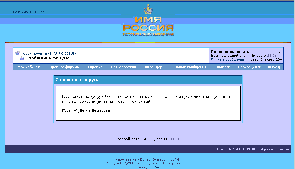 Подобная надпись, что у них стоит является "стандартной" при выключение форума, обычно выключение форума (для пользователей) применяется во время каких либо технических работ. Какие у них были причины остаётся только гадать, недавно помню видел тему на форуме "Имя Россия" о том нужен ли форум после завершения проекта, может решили прикрыть... но до завершения проекта осталось совсем чучуть (28 декабря) как-то не логично это могли бы 10 дней потерпеть... Если версию форума обновили ранее, а закрыли уже после обновления, то вероятно связано это с тем что многие люди не выдержали того как долго не учитывают их голоса и стали писать на форуме, а администрация не справлялась с удалением сообщений, да и по ночам вроде их администрация спит, может утром включат. Время покажет....