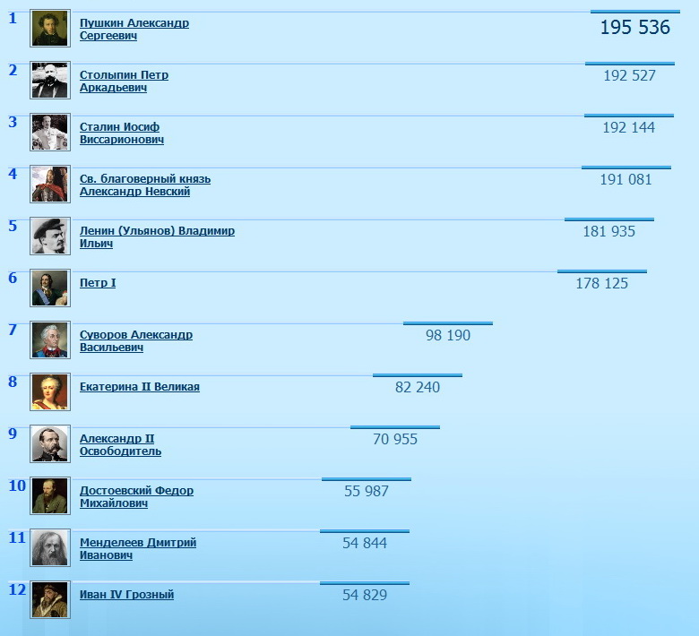 1 Пушкин Александр Сергеевич 195 536 2 Столыпин Петр Аркадьевич 192 527 3 Сталин Иосиф Виссарионович 192 144 4 Св. благоверный князь Александр Невский 191 081 5 Ленин (Ульянов) Владимир Ильич 181 935 6 Петр I 178 125 7 Суворов Александр Васильевич 98 190 8 Екатерина II Великая 82 240 9 Александр II Oсвободитель 70 955 10 Достоевский Федор Михайлович 55 987 11 Менделеев Дмитрий Иванович 54 844 12 Иван IV Грозный 54 829