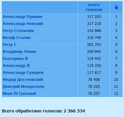 1. Александр Пушкин 317 293 2. Александр Невский 317 218 3. Петр Столыпин 316 886 4. Иосиф Сталин 316 749 5. Петр I 262 703 6. Владимир Ленин 249 940 7. Екатерина II 119 402 8. Александр II 119 336 9. Александр Суворов 117 817 10. Федор Достоевский 76 408 11. Дмитрий Менделеев 76 325 12. Иван IV Грозный 76 257 P.S. Натуральный идиотизм Столыпин от лидеров отставал на 60 тысяч голосов в суммарном рейтинге, а теперь за 34 часа сравнялся с ними! Полный бред! А за это времен ему накинули 73 868 голосов в общий рейтинг. Такого роста за столь короткое время наверно не у кого не было, и стоит полагать что в один день около 57 тысяч платных звонков поступило в поддержку Столыпина, откуда столько народу?