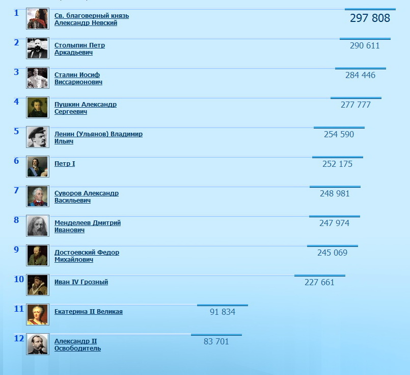 1 Св. благоверный князь Александр Невский 303 000 2 Столыпин Петр Аркадьевич 291 188 3 Сталин Иосиф Виссарионович 286 438 4 Пушкин Александр Сергеевич 278 301 5 Петр I 256 606 6 Ленин (Ульянов) Владимир Ильич 254 805 7 Менделеев Дмитрий Иванович 249 383 8 Суворов Александр Васильевич 249 089 9 Достоевский Федор Михайлович 245 125 10 Иван IV Грозный 227 686 11 Екатерина II Великая 91 885 12 Александр II Oсвободитель 83 764