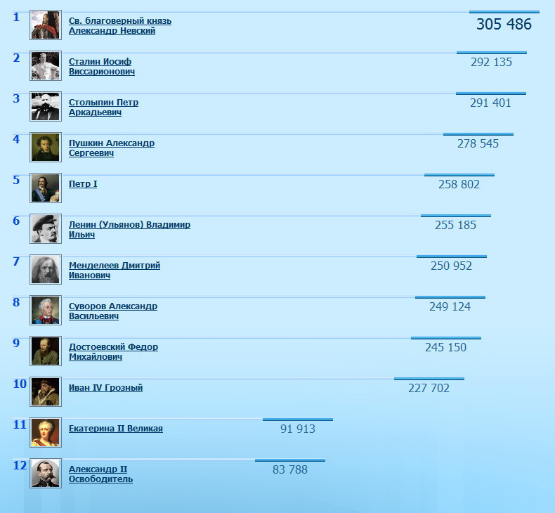 1 Св. благоверный князь Александр Невский 305 486 2 Сталин Иосиф Виссарионович 292 135 3 Столыпин Петр Аркадьевич 291 401 4 Пушкин Александр Сергеевич 278 545 5 Петр I 258 802 6 Ленин (Ульянов) Владимир Ильич 255 185 7 Менделеев Дмитрий Иванович 250 952 8 Суворов Александр Васильевич 249 124 9 Достоевский Федор Михайлович 245 150 10 Иван IV Грозный 227 702 11 Екатерина II Великая 91 913 12 Александр II Oсвободитель 83 788